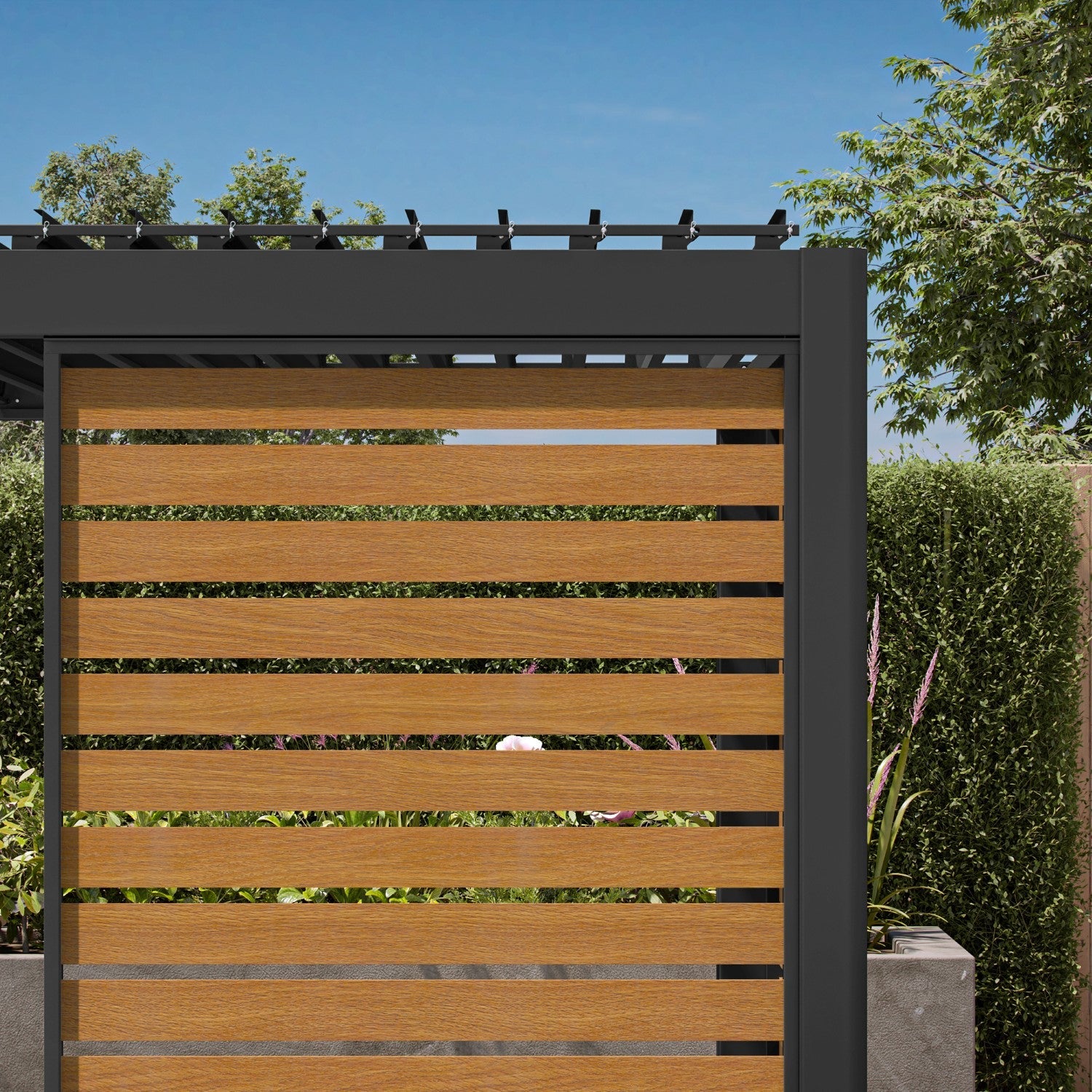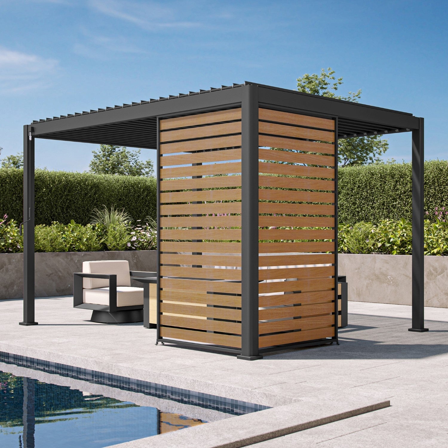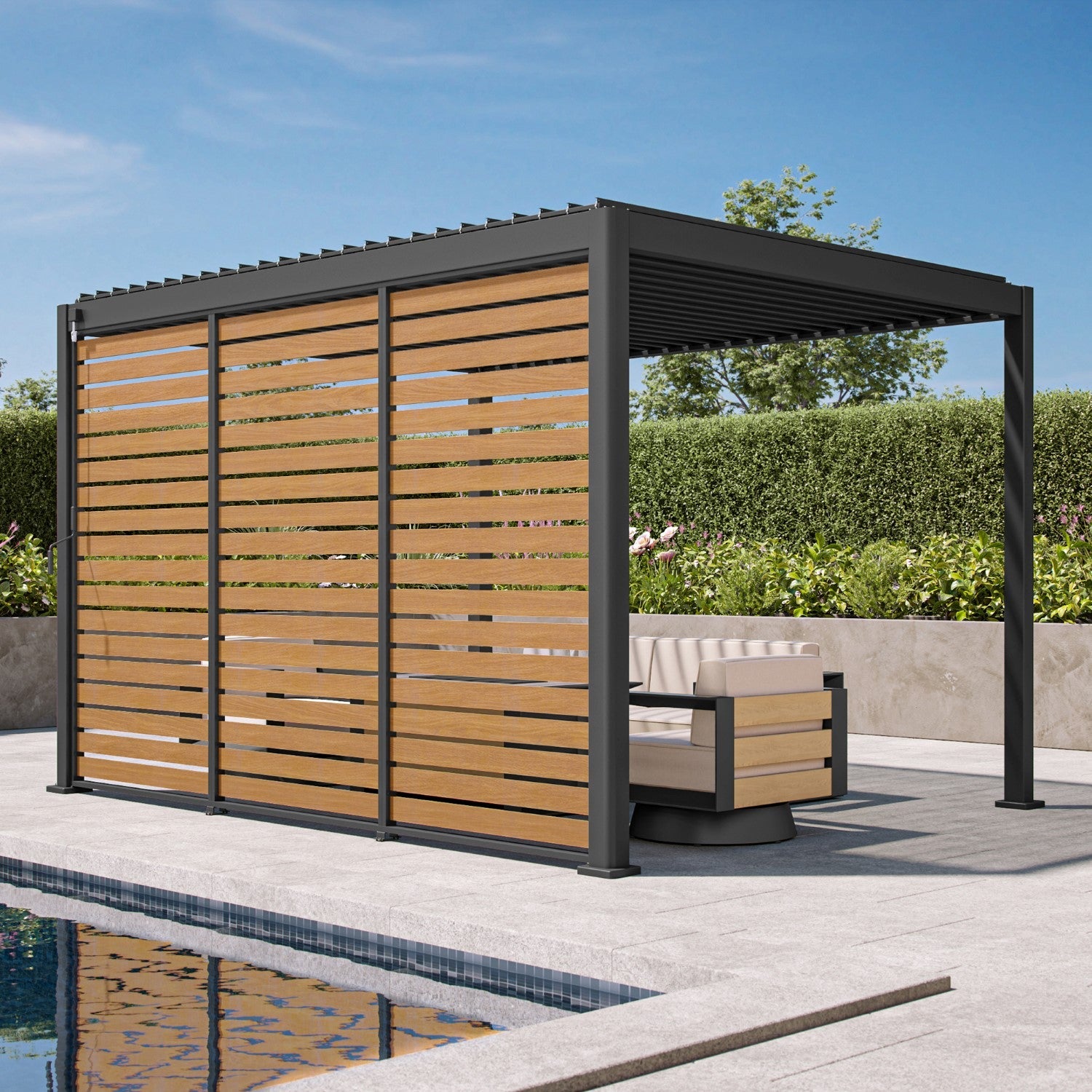 The 111 accessory Decowall Panorama with the Takasho wood finish adds privacy and protection with a touch of “nature” to your outdoor dream room.